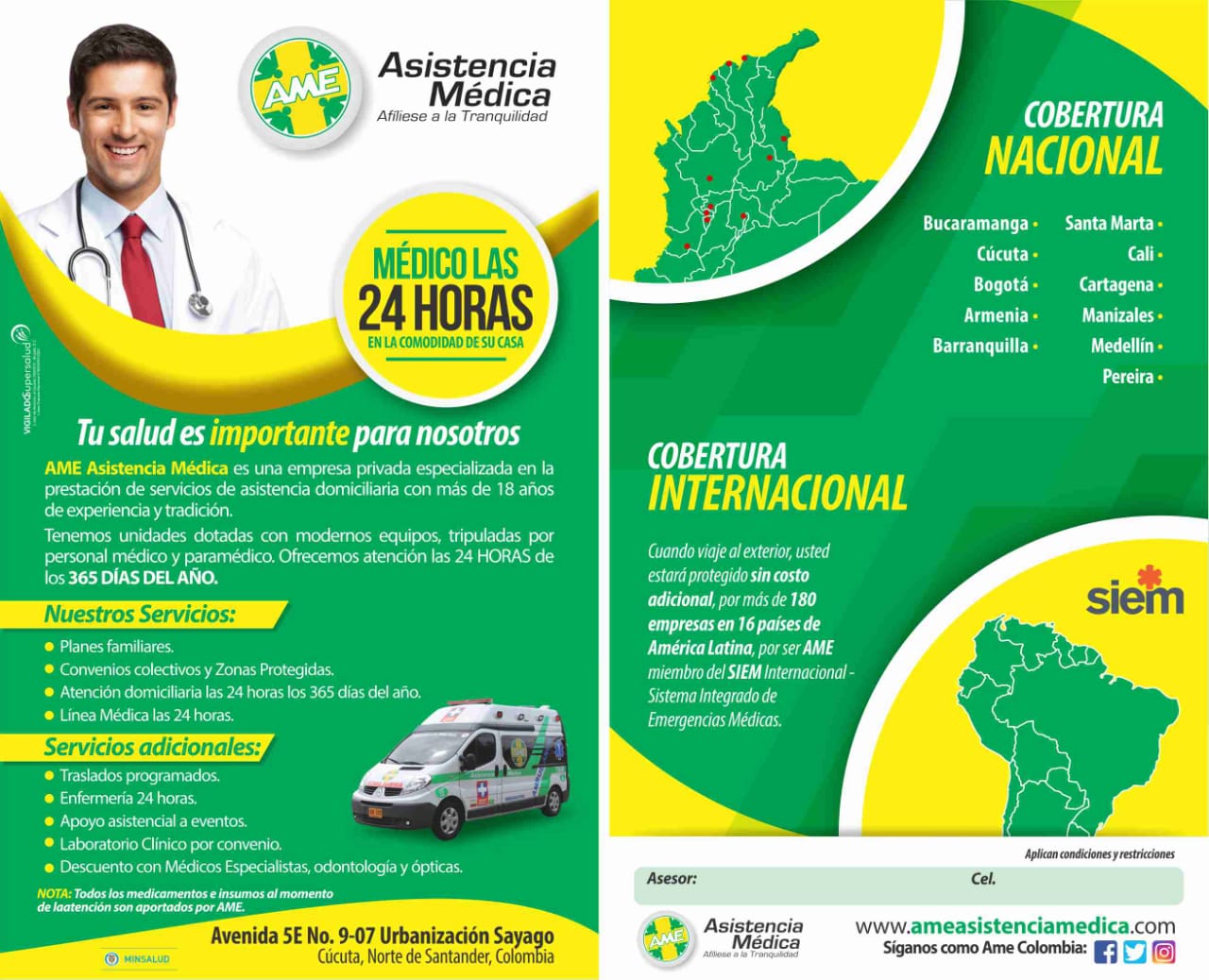 SAMI Tweet Salud | Visto: 139274 Asesor: FLOR SANCHEZ Celular: 3175025404 SERVICIOS Médicos SUCURSALES CÚCUTA - BUCARAMANGA - SANTA MARTA Empresas relacionadas AME Dejar comentario Estás comentando como invitado. Enviar comentario